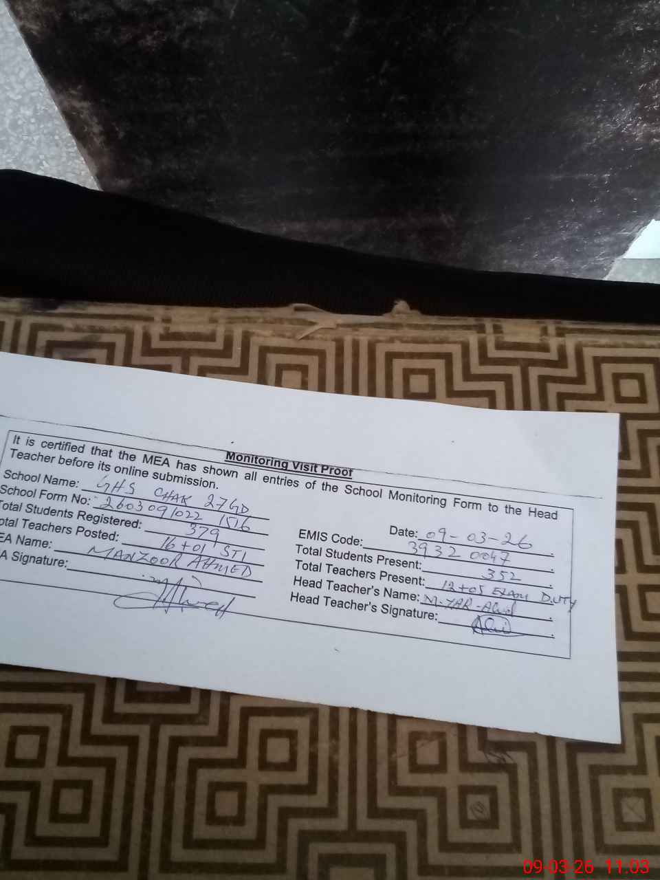 | Certified that this School was Inspected by the Undersigned MEA/DMO Today and the Information Stated Above is as Per Record. | |||||