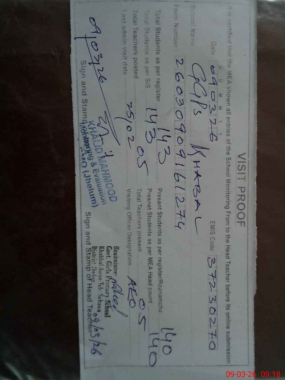 | Attendance Register | Head Teacher | MEA with School | Visit Proof |