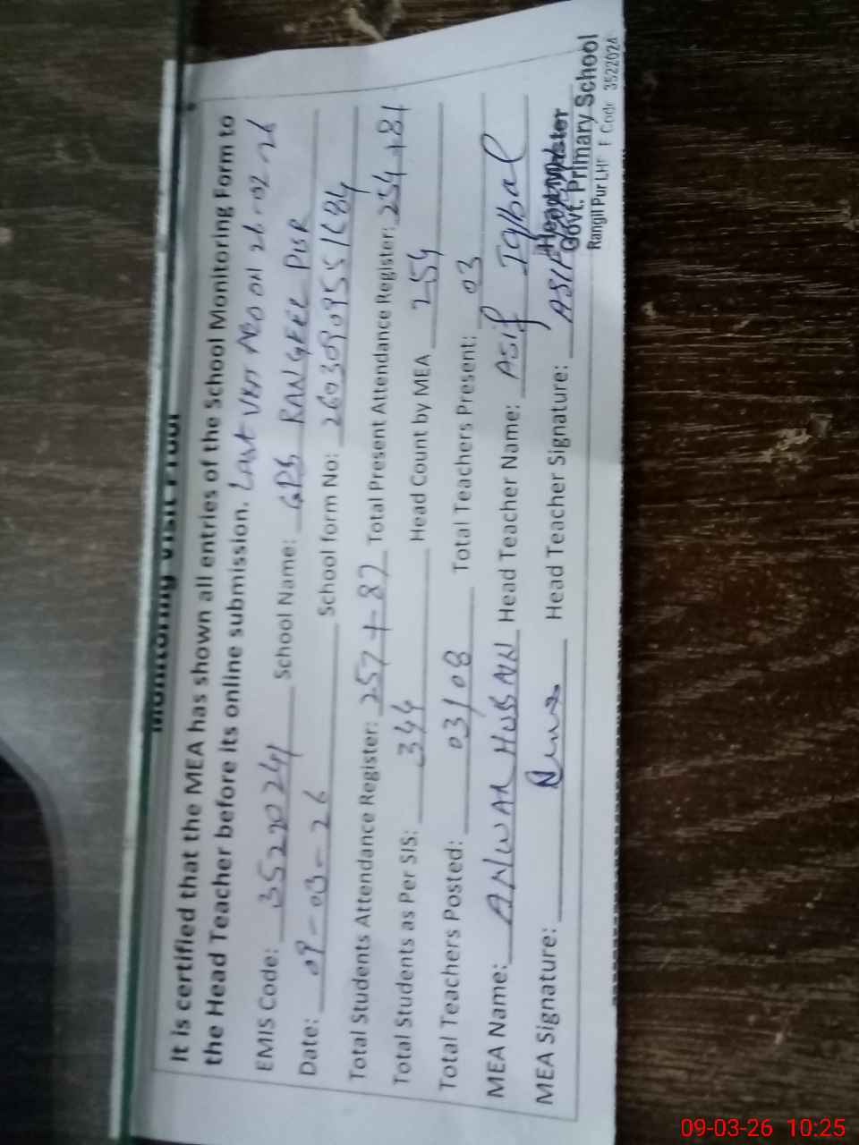 | Certified that this School was Inspected by the Undersigned MEA/DMO Today and the Information Stated Above is as Per Record. | |||||