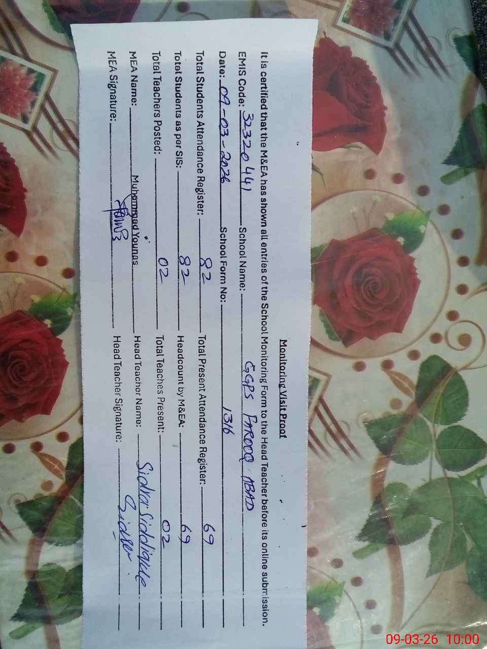 | Attendance Register | Head Teacher | MEA with School | Visit Proof |