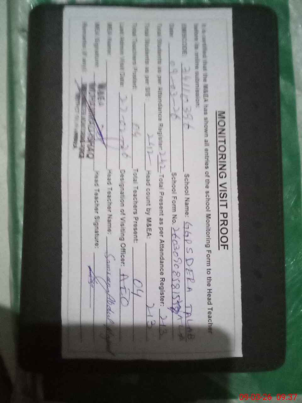 | Attendance Register | Head Teacher | MEA with School | Visit Proof |