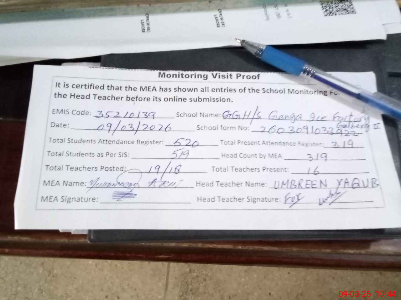 | Attendance Register | Head Teacher | MEA with School | Visit Proof |