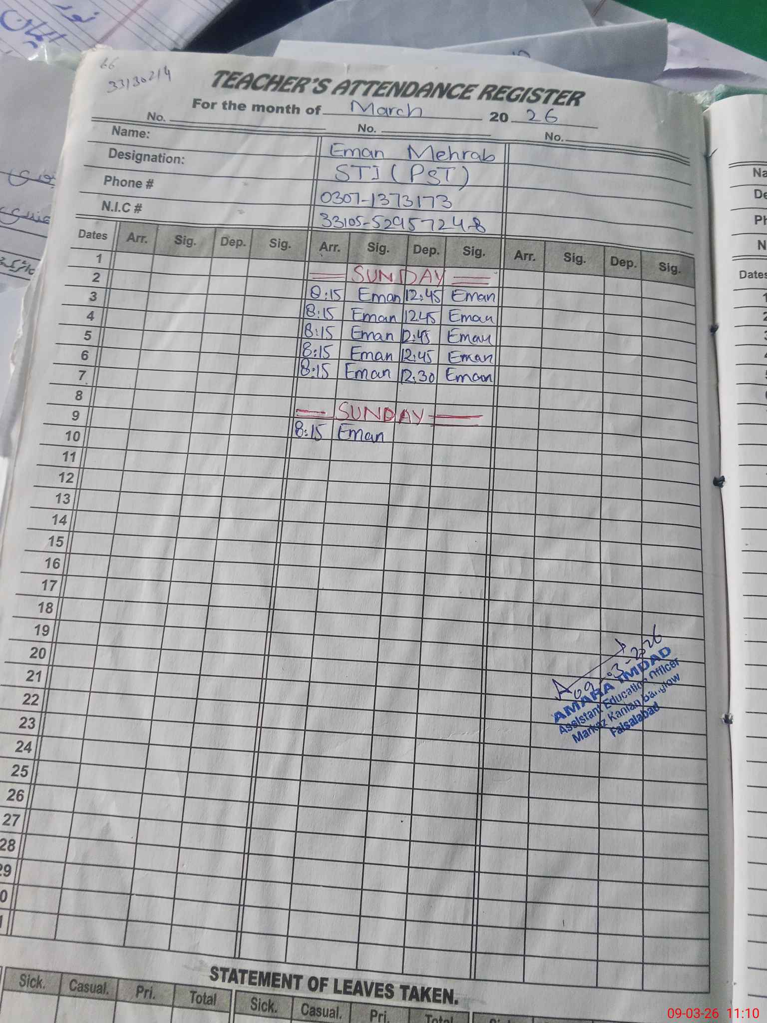 | Name: SA**** SA**** Designation: (School Headmaster's/Headmistress's) PST Phone/Cell Number: 03**** |
