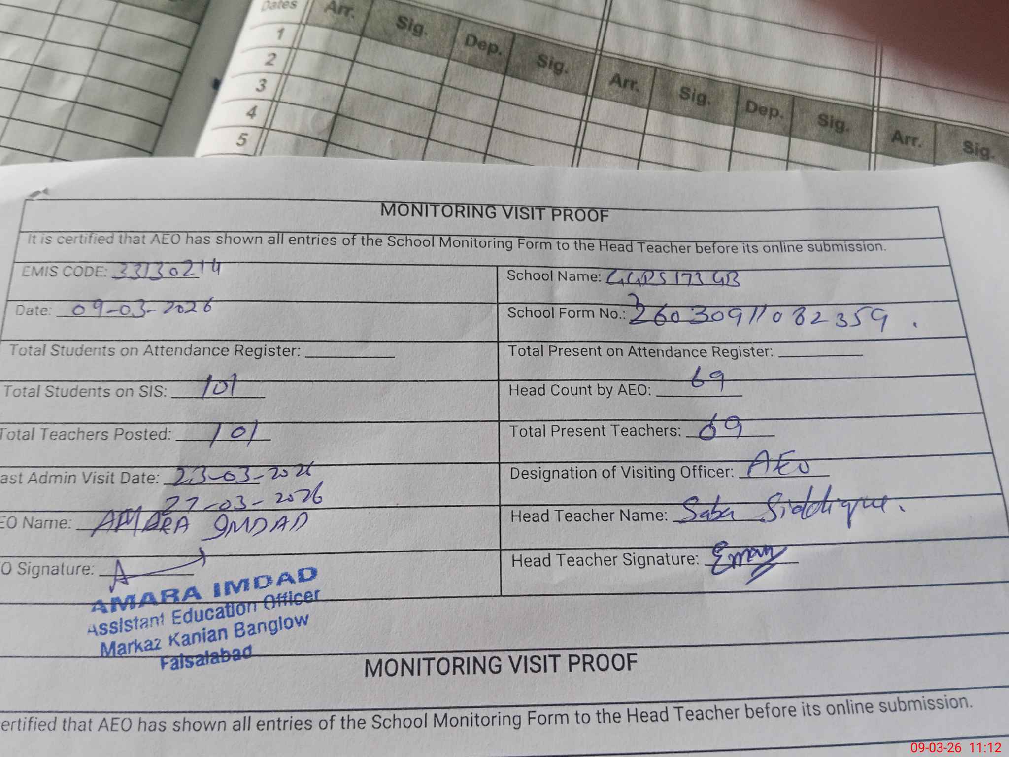 | Monitoring Date: 09-03-2026 | Start Time: 09-03-2026 10:59 AM | End Time: 09-03-2026 11:12 AM | Name of MEA: Am**** Im**** | |