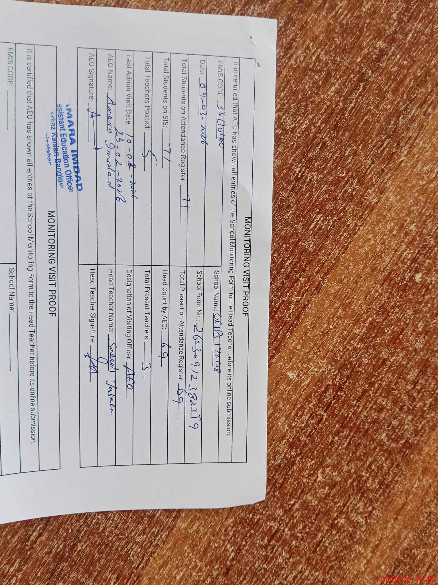 | Attendance Register | Head Teacher | MEA with School | Visit Proof |