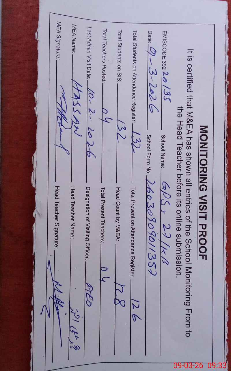 | EMIS Code: 39220135 | Name of School: GPS CHAK NO. 27 KB P.O QABOOLA | |||