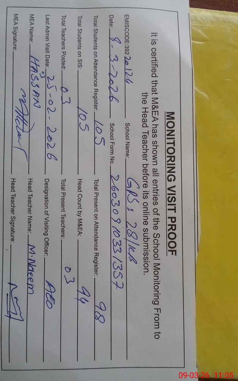 | EMIS Code: 39220124 | Name of School: GPS CHAK NO. 28 KB | |||