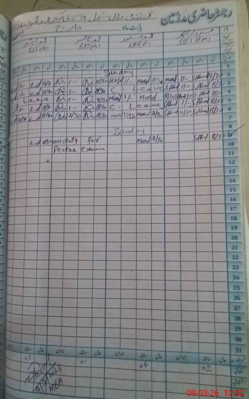 | CNIC | Full Name | Designation | R/C | Absence During Last Calender Month |