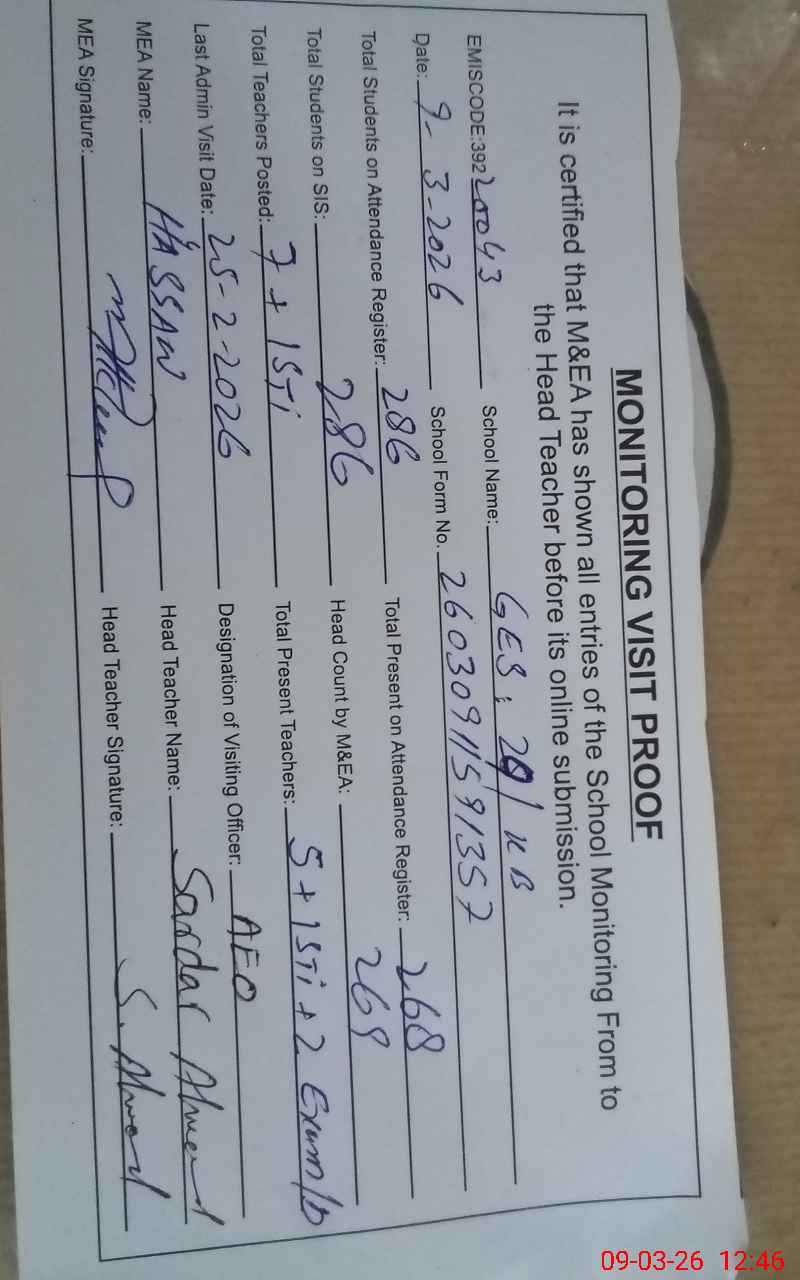 | EMIS Code: 39220043 | Name of School: GES CHAK NO. 29 KB | |||