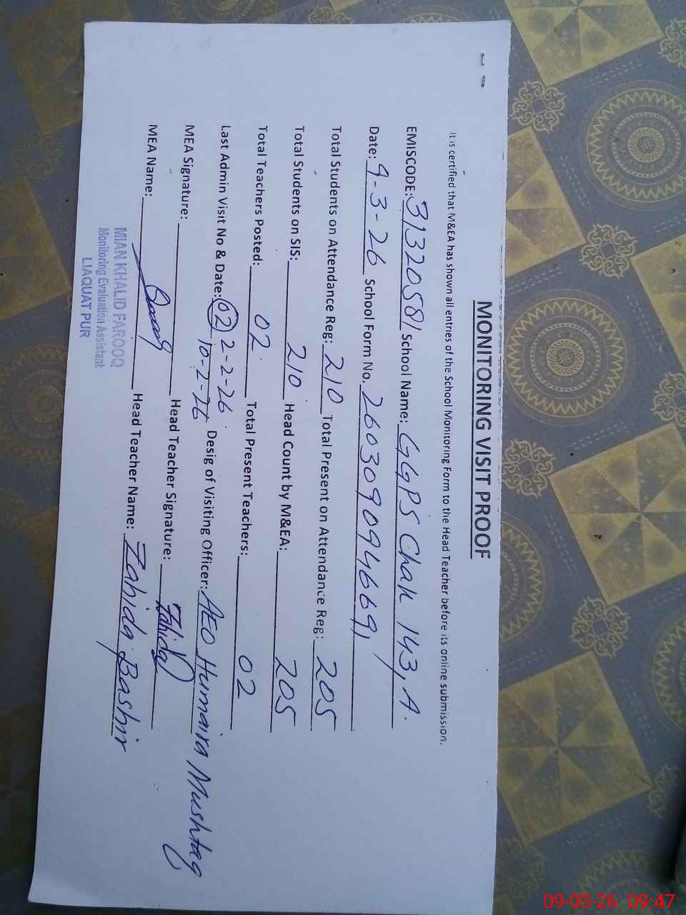 | EMIS Code: 31320581 | Name of School: GGPS CHAK NO.143/A | |||
