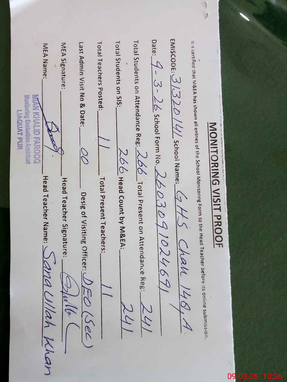 | Attendance Register | Head Teacher | MEA with School | Visit Proof |
