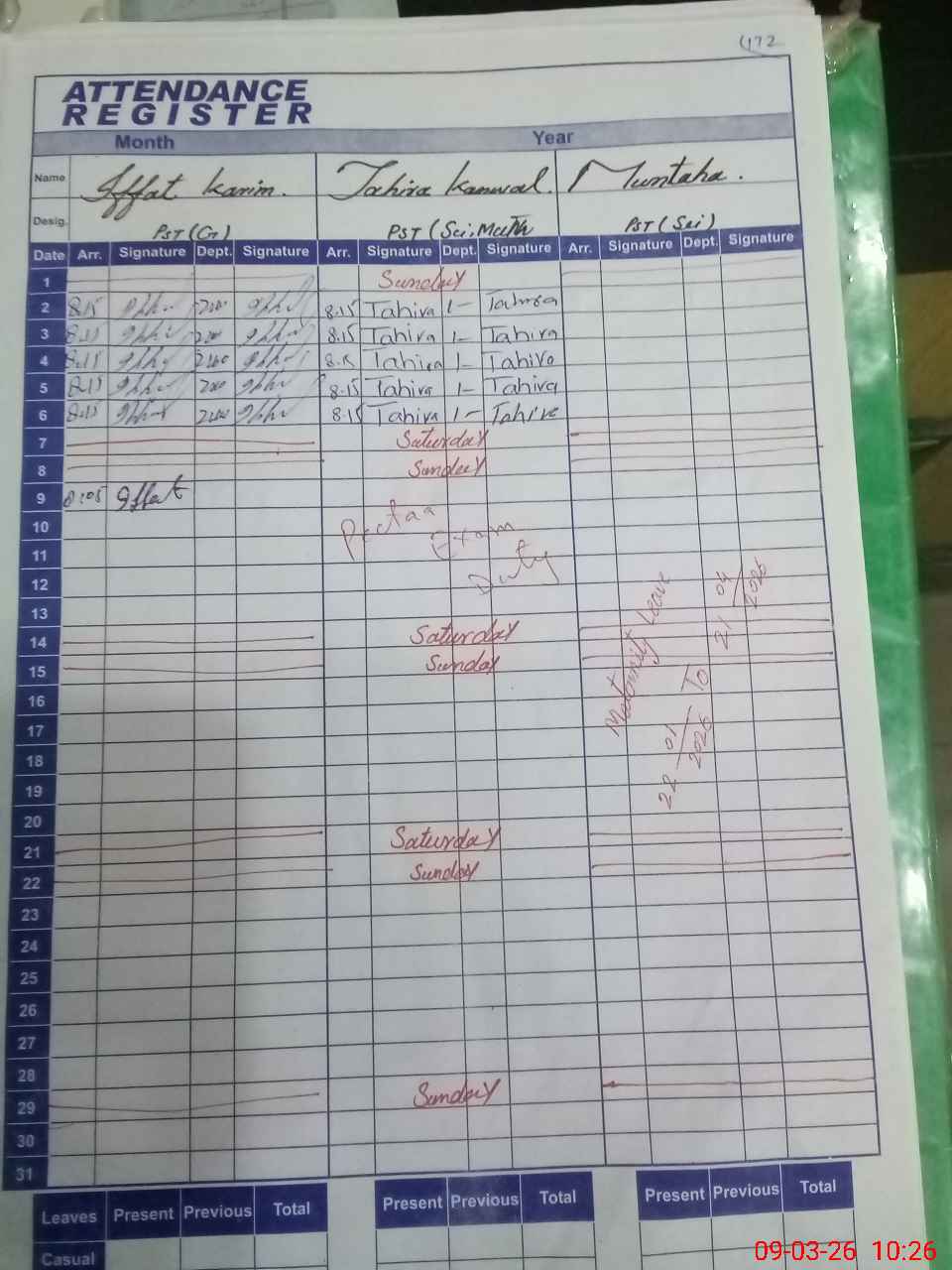 | Leave | Duty | Absent | Maternity | Medical | Ex- Pak |