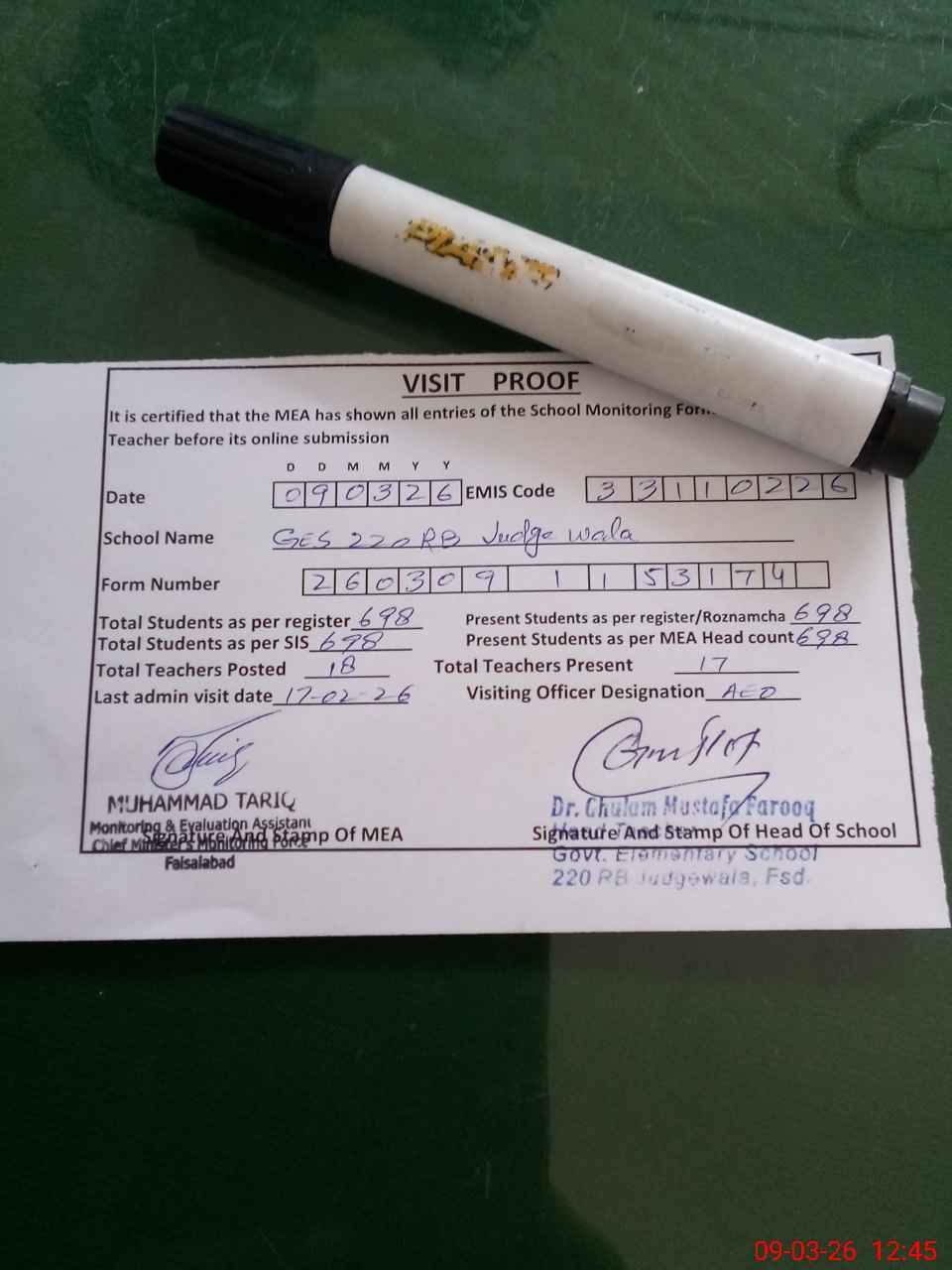 | Attendance Register | Head Teacher | MEA with School | Visit Proof |