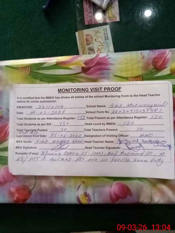 | Remarks (Use Separate Page if Required): Attendance of teaching staff and students on SIS Software is not updated Following Teachers are on PECCTA Exam duty Khawar Zaman SST (HM) GES Maan Asif Mahmood PST GHS Badoke Gosayian Muhammad Atif PST GHS Badoke Gosayian Gulnaz PST GGES Gondalanwala Data as per provided by School Staff and found during physical visit | |||||