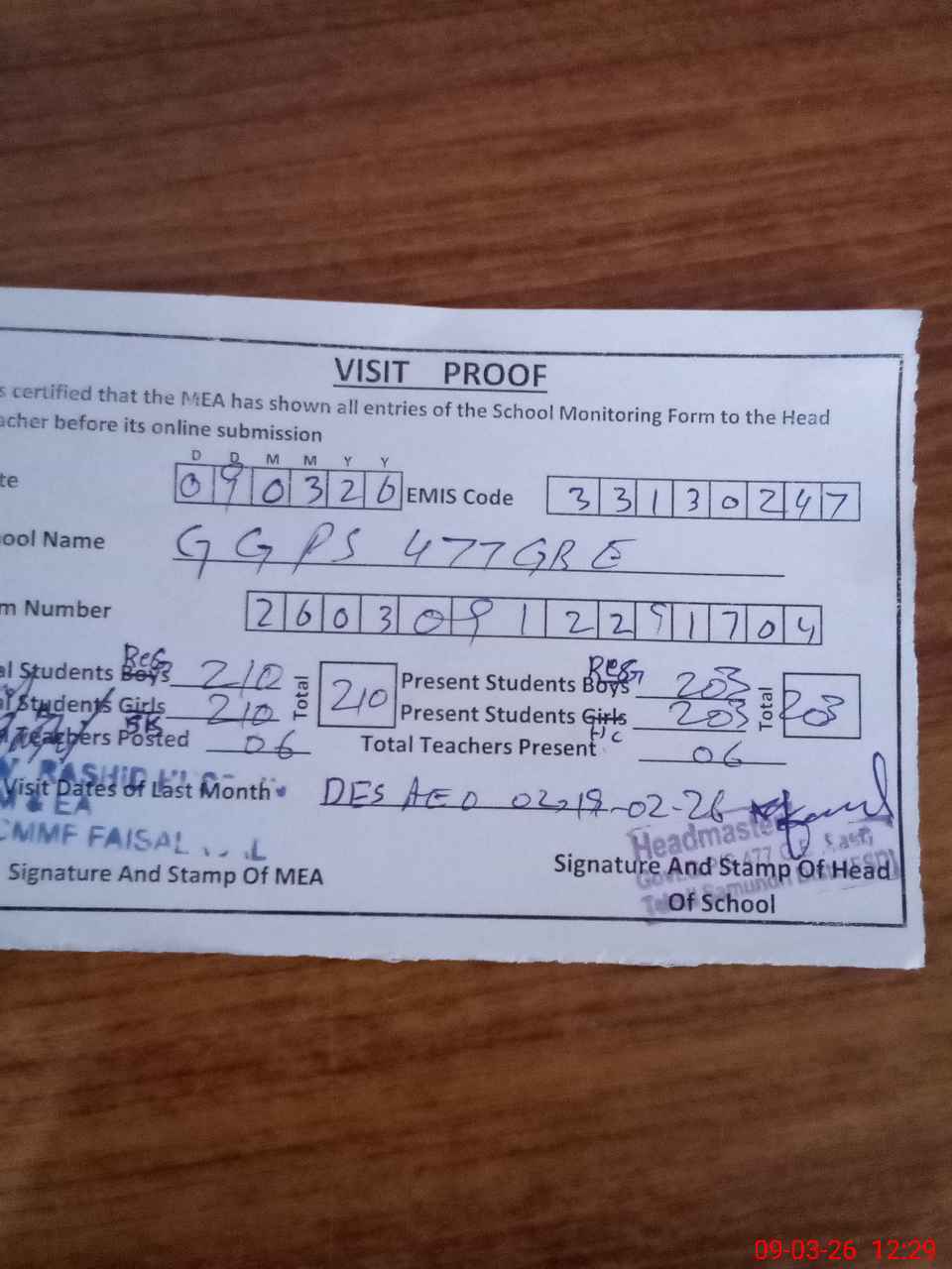 | Attendance Register | Head Teacher | MEA with School | Visit Proof |