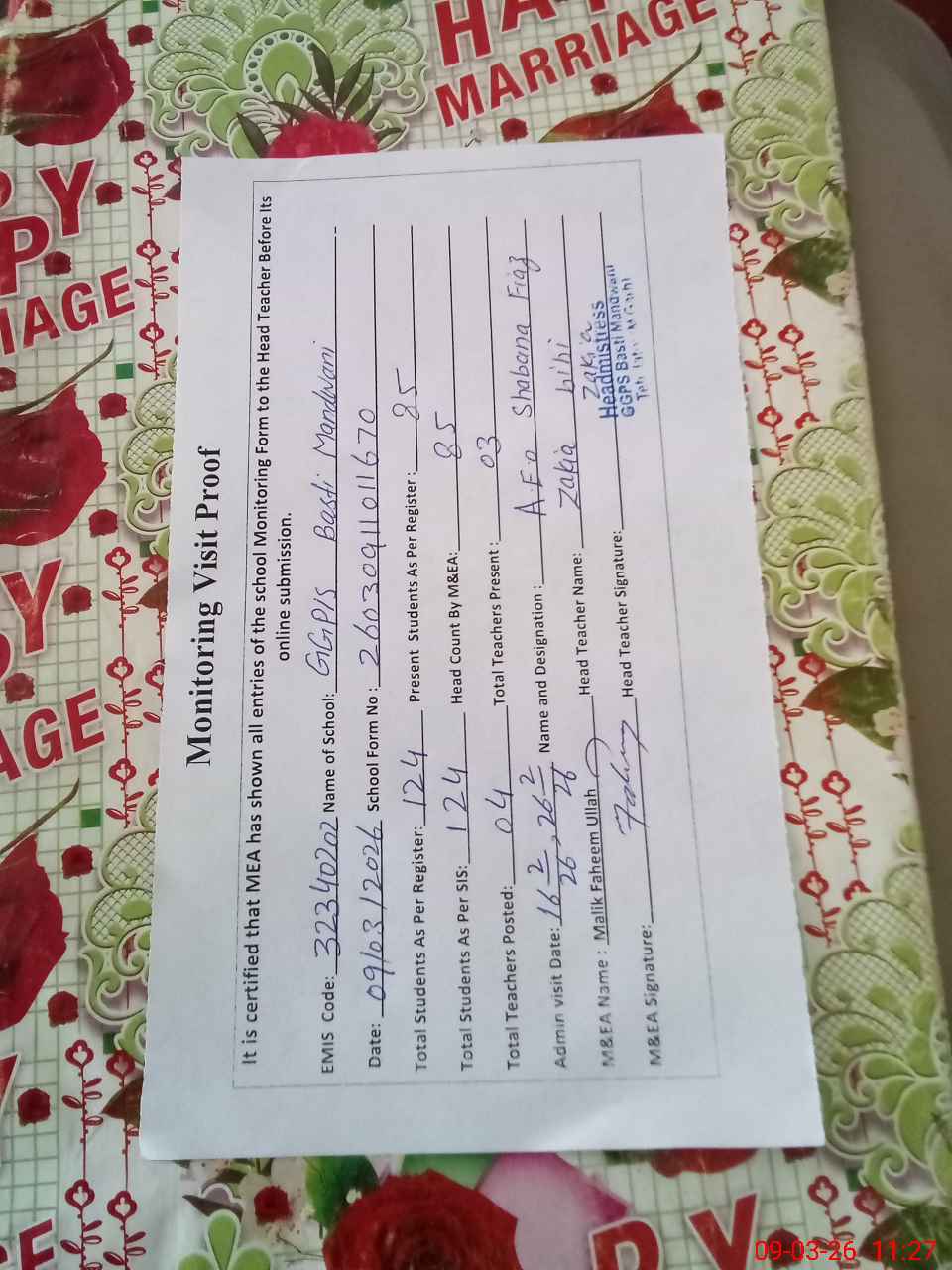 | Attendance Register | Head Teacher | MEA with School | Visit Proof |