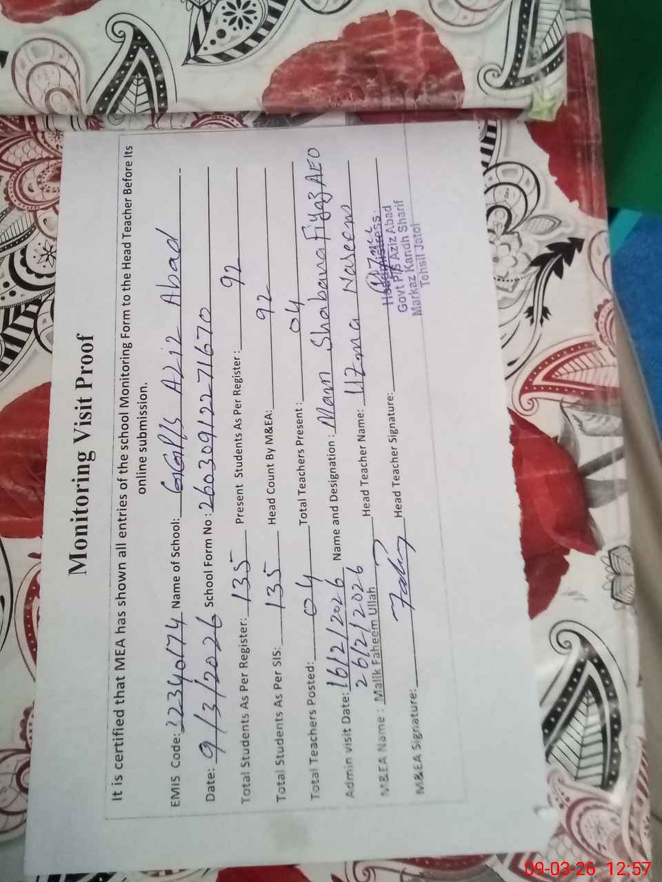 | Attendance Register | Head Teacher | MEA with School | Visit Proof |