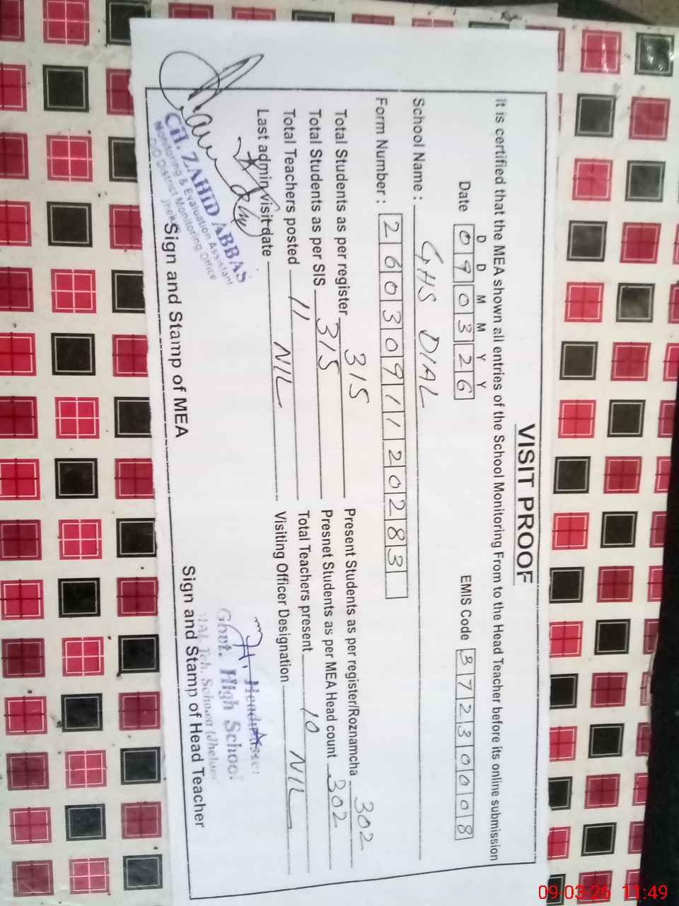 | Certified that this School was Inspected by the Undersigned MEA/DMO Today and the Information Stated Above is as Per Record. | |||||