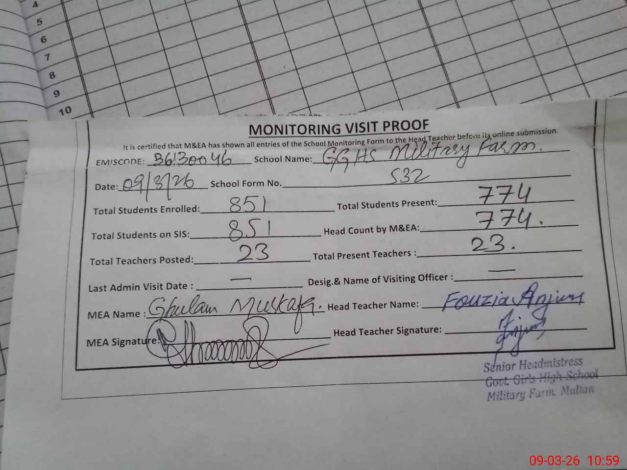 | EMIS Code: 36130046 | Name of School: GGHS MILITARY FARM MULTAN | |||