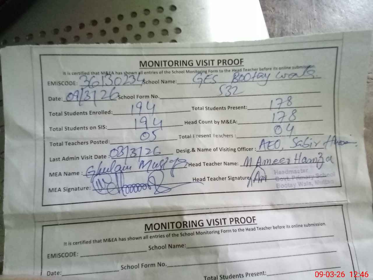 | Attendance Register | Head Teacher | MEA with School | Visit Proof |