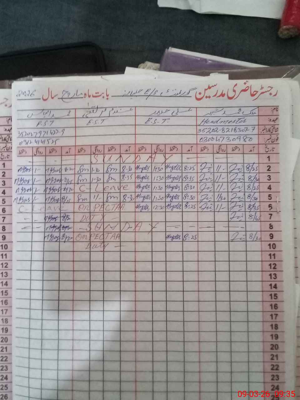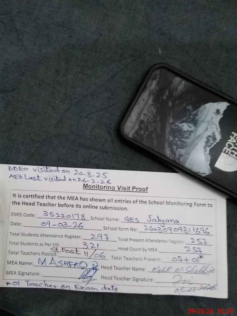 | Remarks (Use Separate Page if Required): DDEO Mubashar Shahzad visited on 20-08-2025 AEO Walid Ashraf last visited on 26-02-2026 School has total 09 rooms, here 02 classrooms are under construction but in use and 02 classrooms are dangerous and not in use School has 06 toilets while 01 toilet is non functional due toilet sheet damaged Class 8th students went for PECTAA exam NSB register not maintained for last month, Bank statements of both accounts not available Cleaning is not up to standard School has large ground but looking so muddy 35220178 | |||||