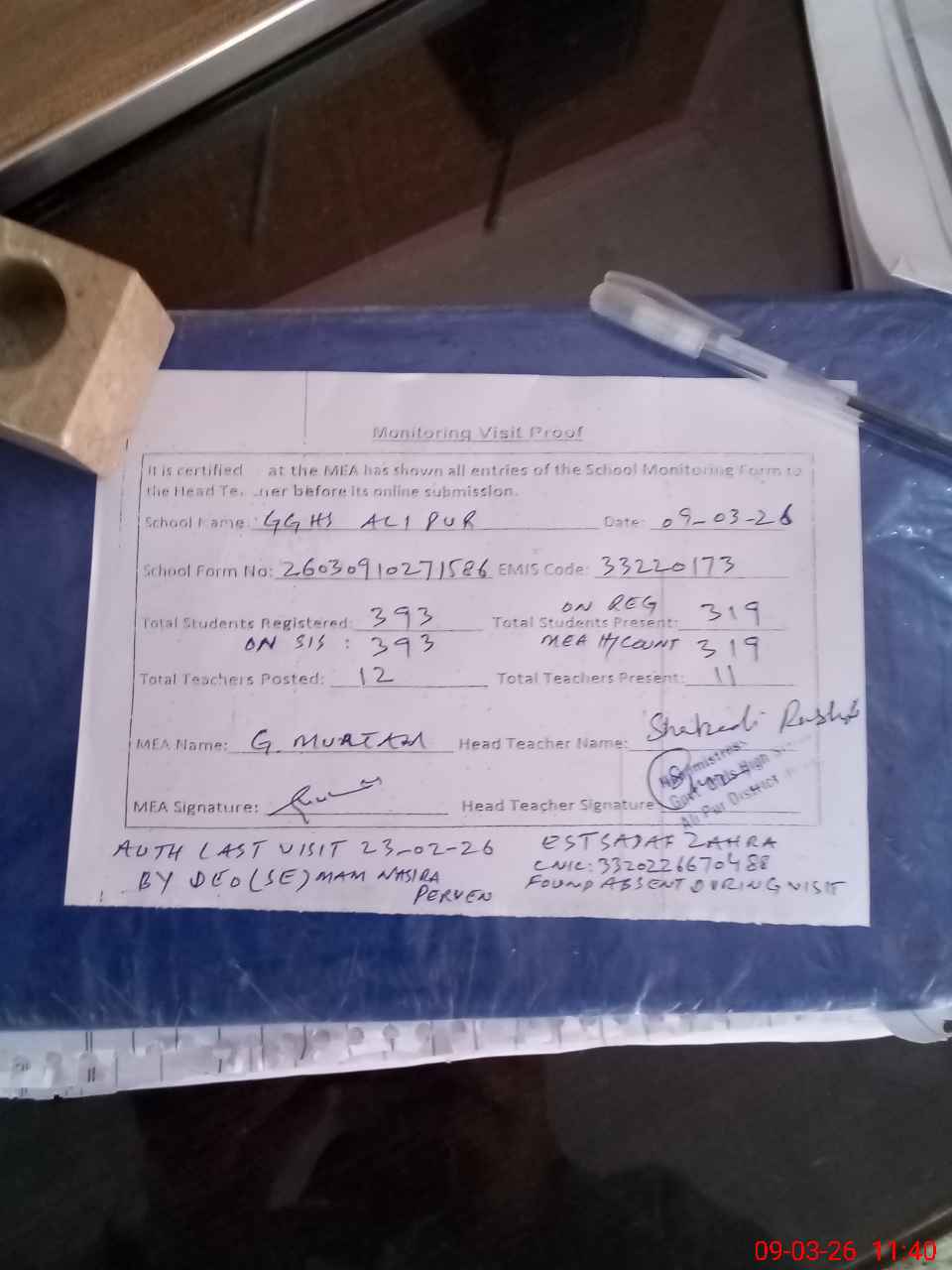 | Attendance Register | Head Teacher | MEA with School | Visit Proof |