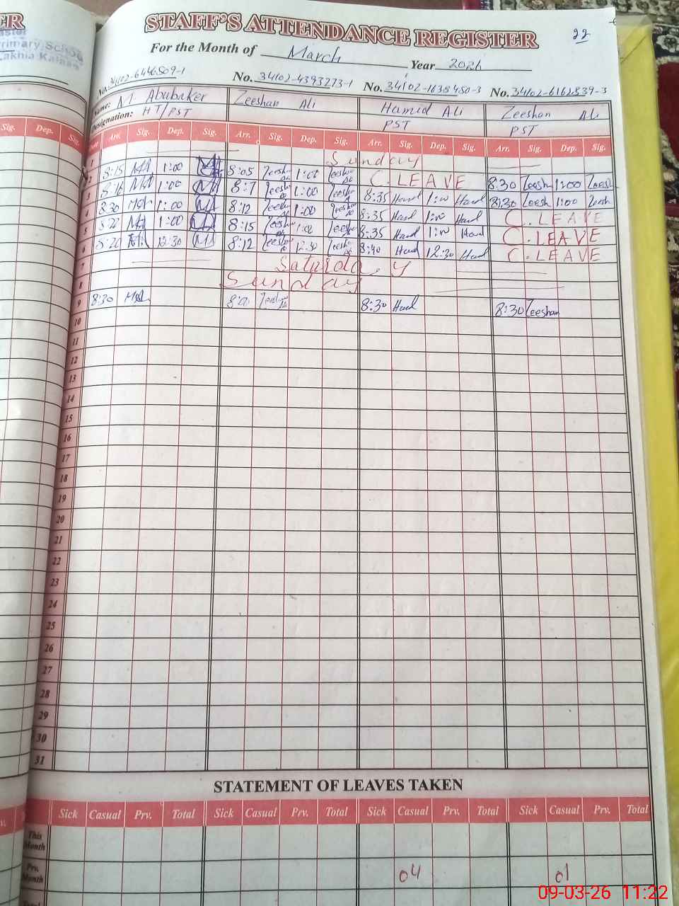 | Leave | Duty | Absent | Maternity | Medical | Ex- Pak |