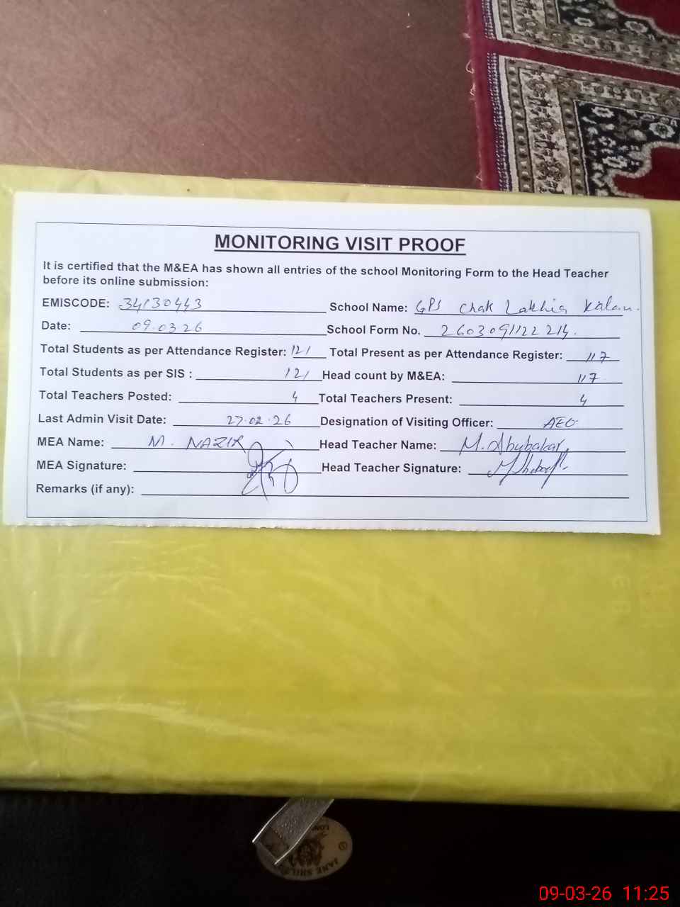 | Attendance Register | Head Teacher | MEA with School | Visit Proof |
