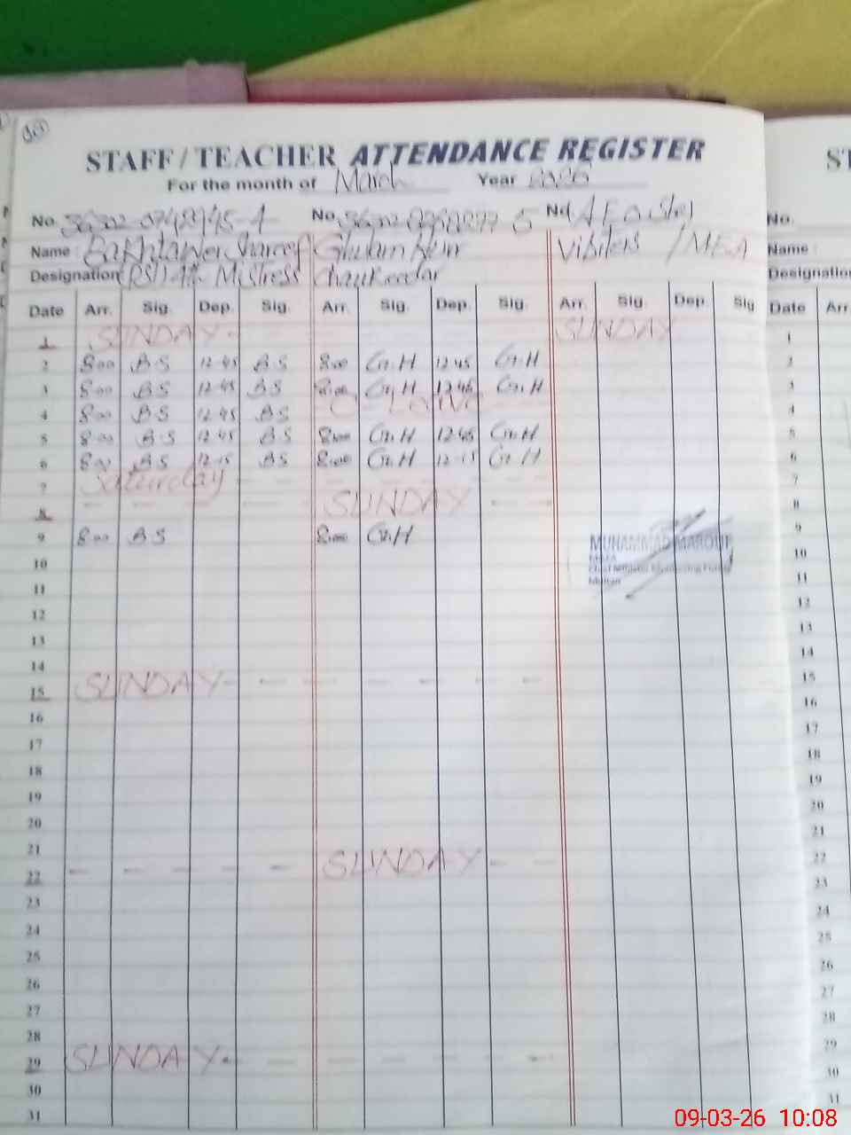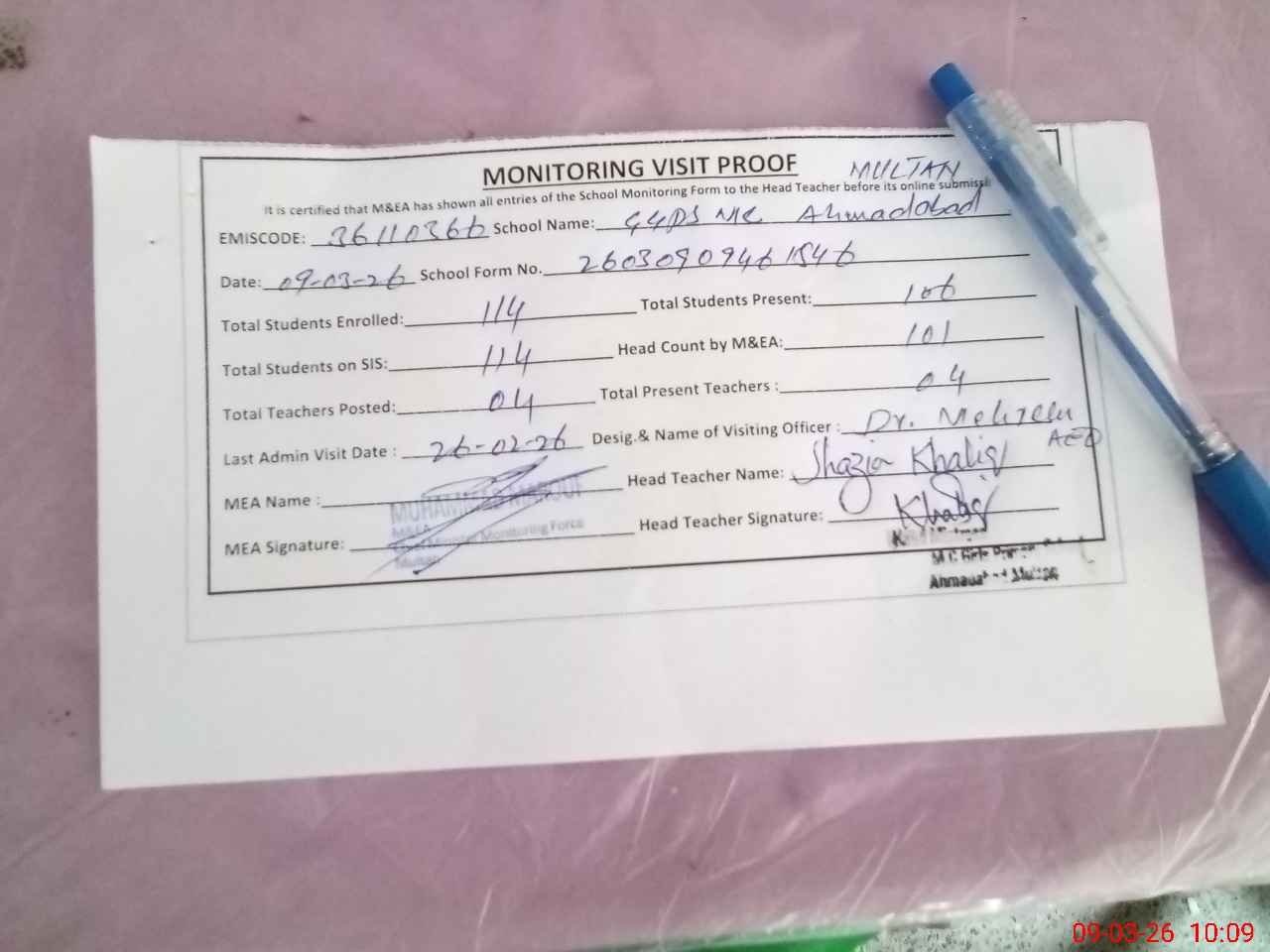 | Attendance Register | Head Teacher | MEA with School | Visit Proof |