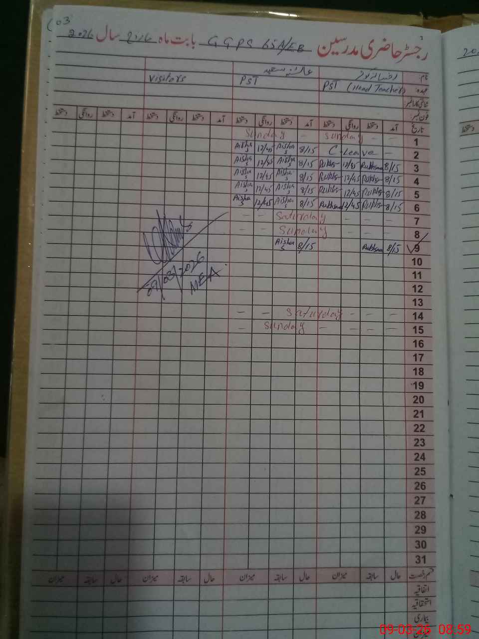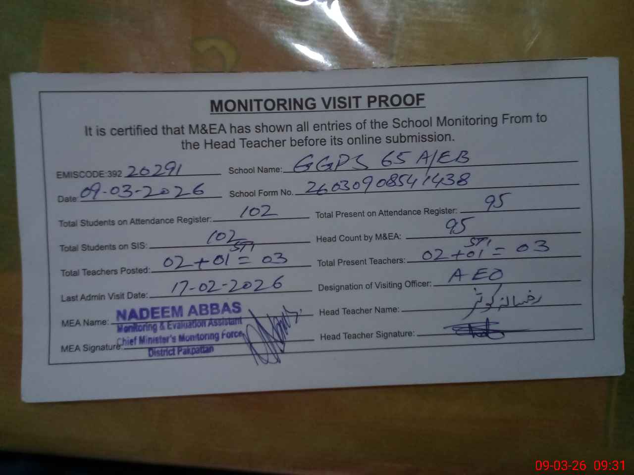 | Attendance Register | Head Teacher | MEA with School | Visit Proof |