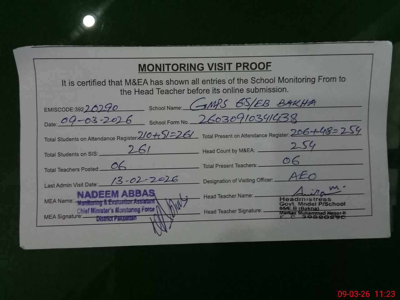 | Attendance Register | Head Teacher | MEA with School | Visit Proof |