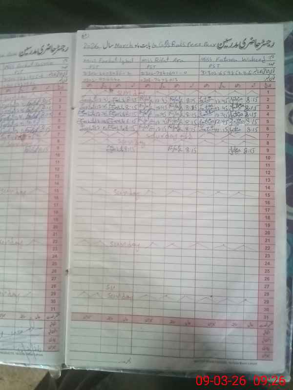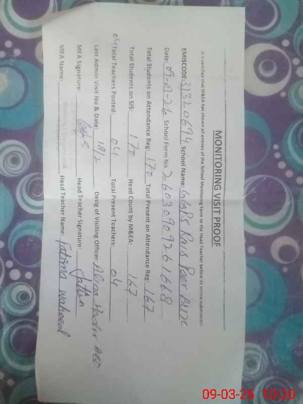 | Name: RI**** AR**** Designation: (School Headmaster's/Headmistress's) PST Phone/Cell Number: 03**** |