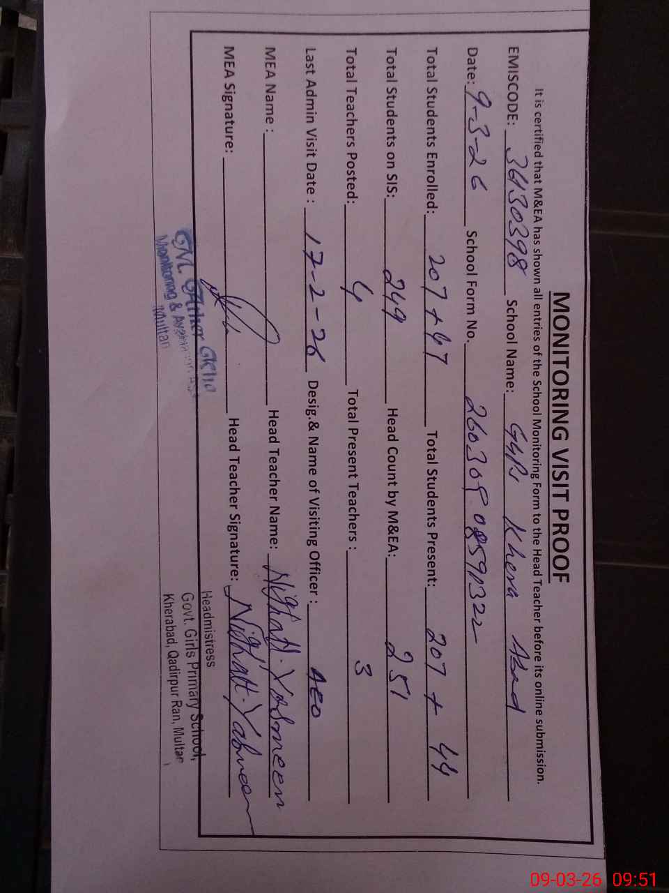 | Certified that this School was Inspected by the Undersigned MEA/DMO Today and the Information Stated Above is as Per Record. | |||||