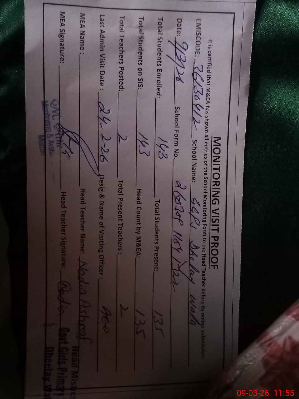| Attendance Register | Head Teacher | MEA with School | Visit Proof |