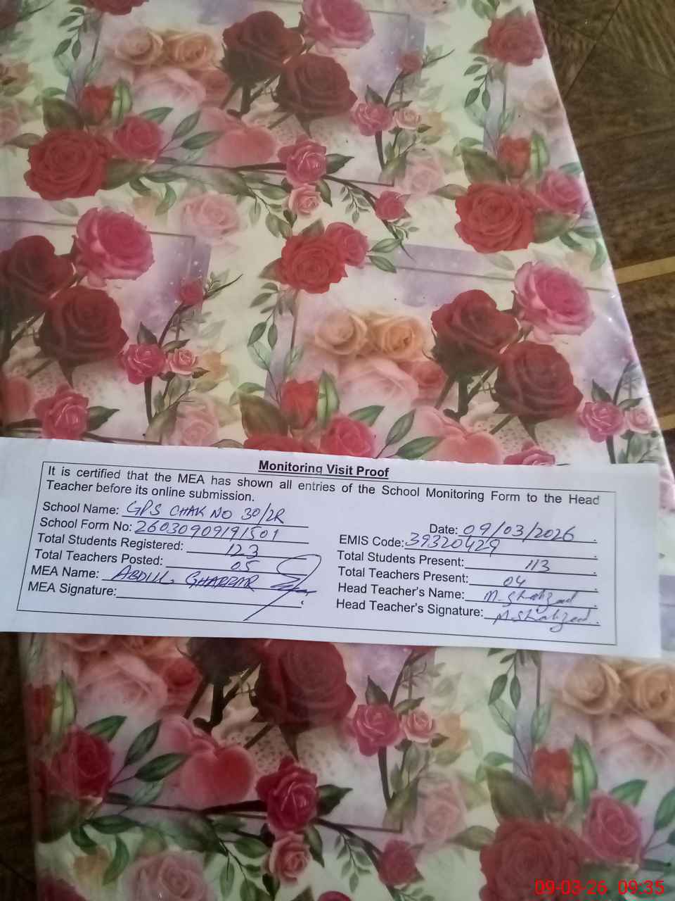 | Attendance Register | Head Teacher | MEA with School | Visit Proof |