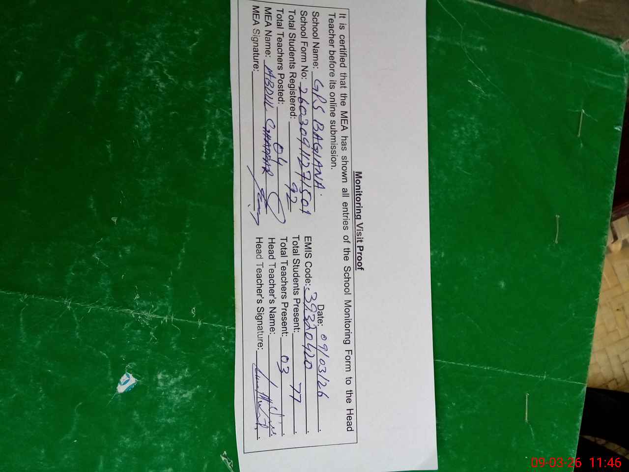 | Attendance Register | Head Teacher | MEA with School | Visit Proof |
