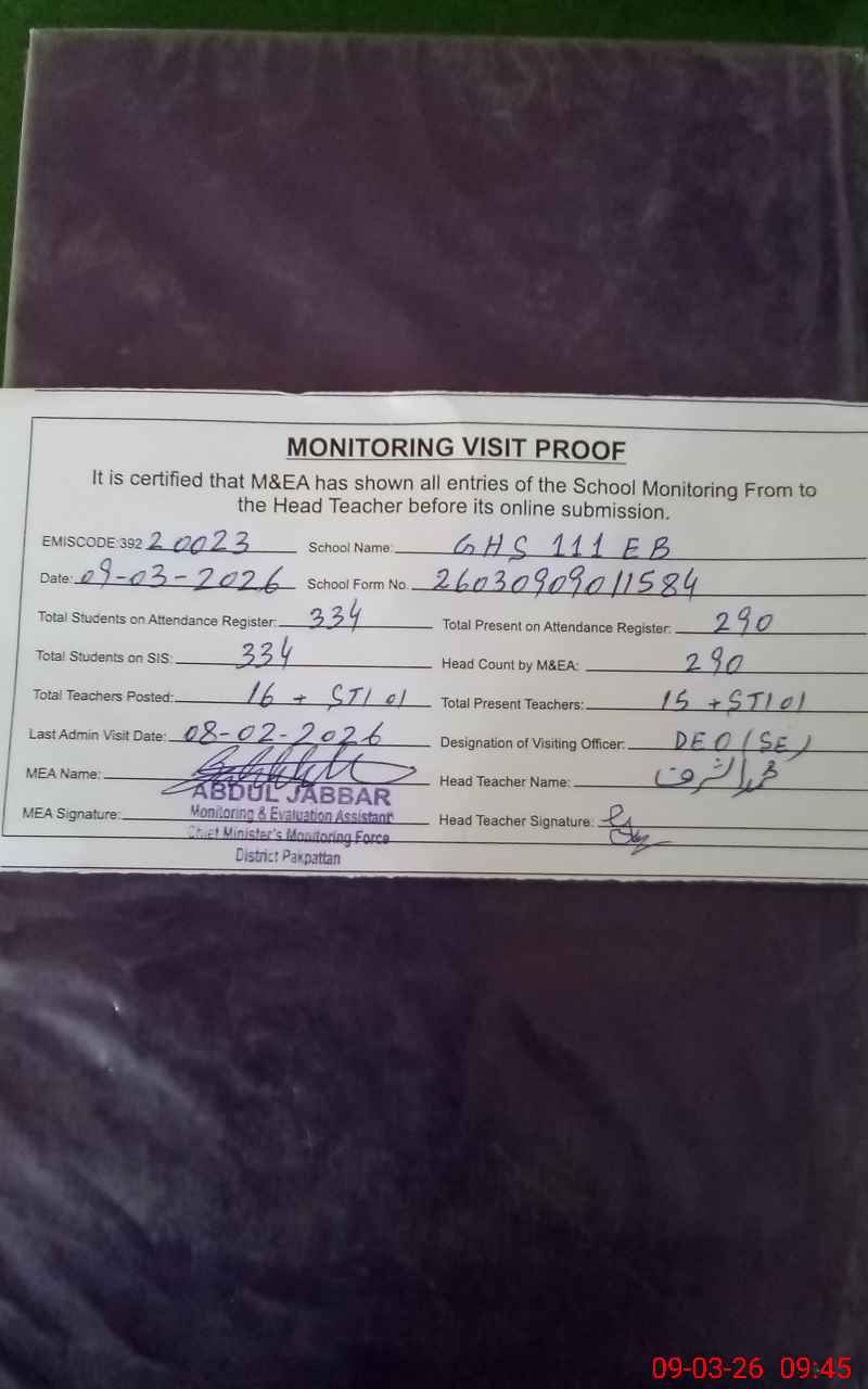 | EMIS Code: 39220023 | Name of School: GHS 111 EB | |||