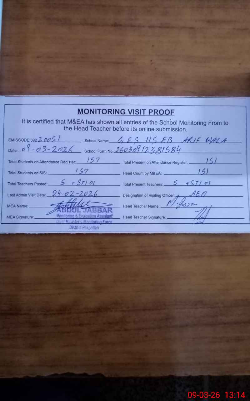 | EMIS Code: 39220051 | Name of School: GES 115 EB ARIF WALA | |||