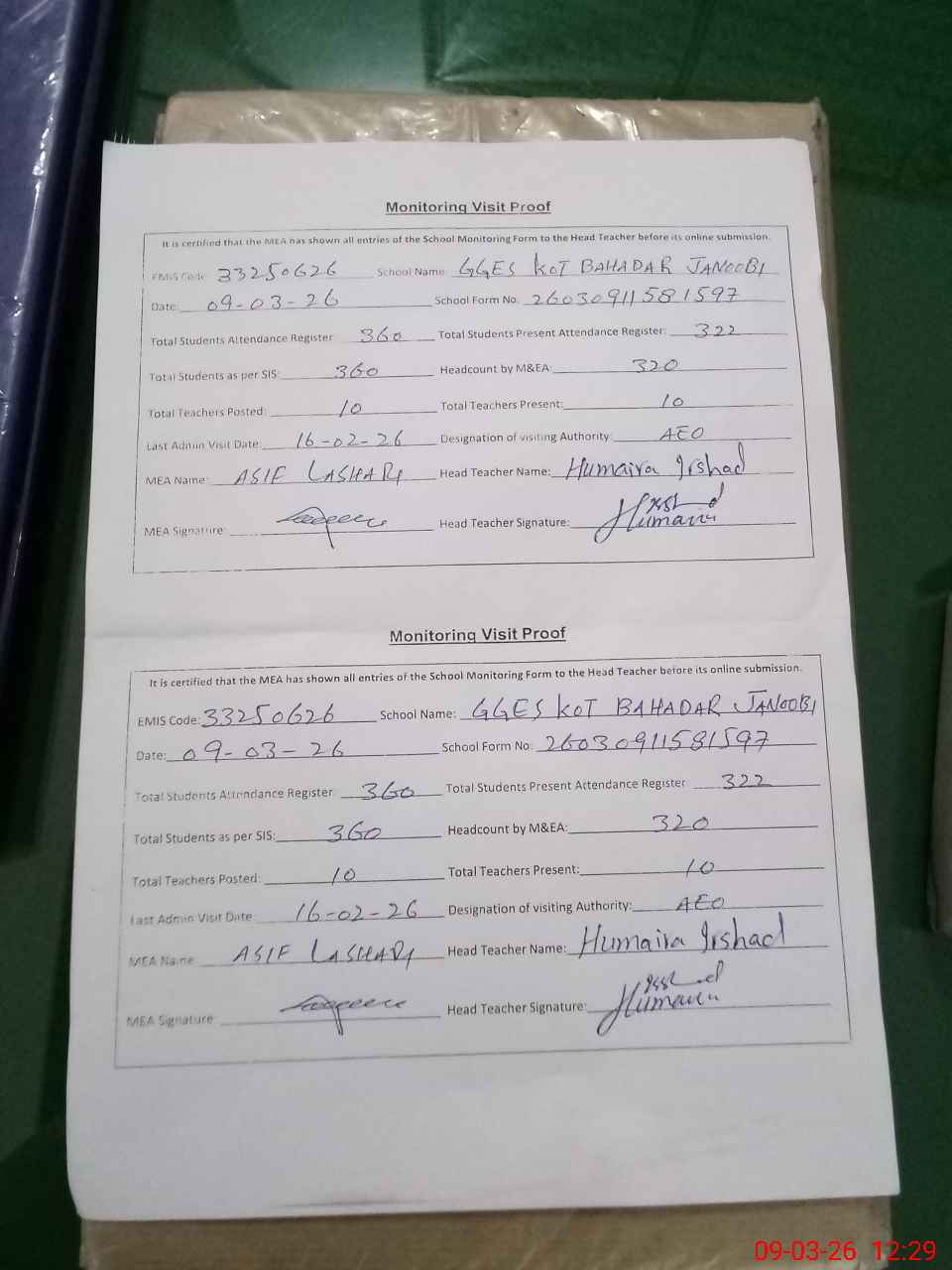 | Attendance Register | Head Teacher | MEA with School | Visit Proof |