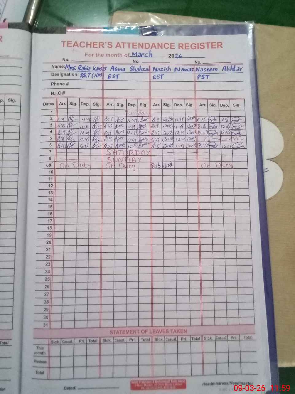 | Leave | Duty | Absent | Maternity | Medical | Ex- Pak |