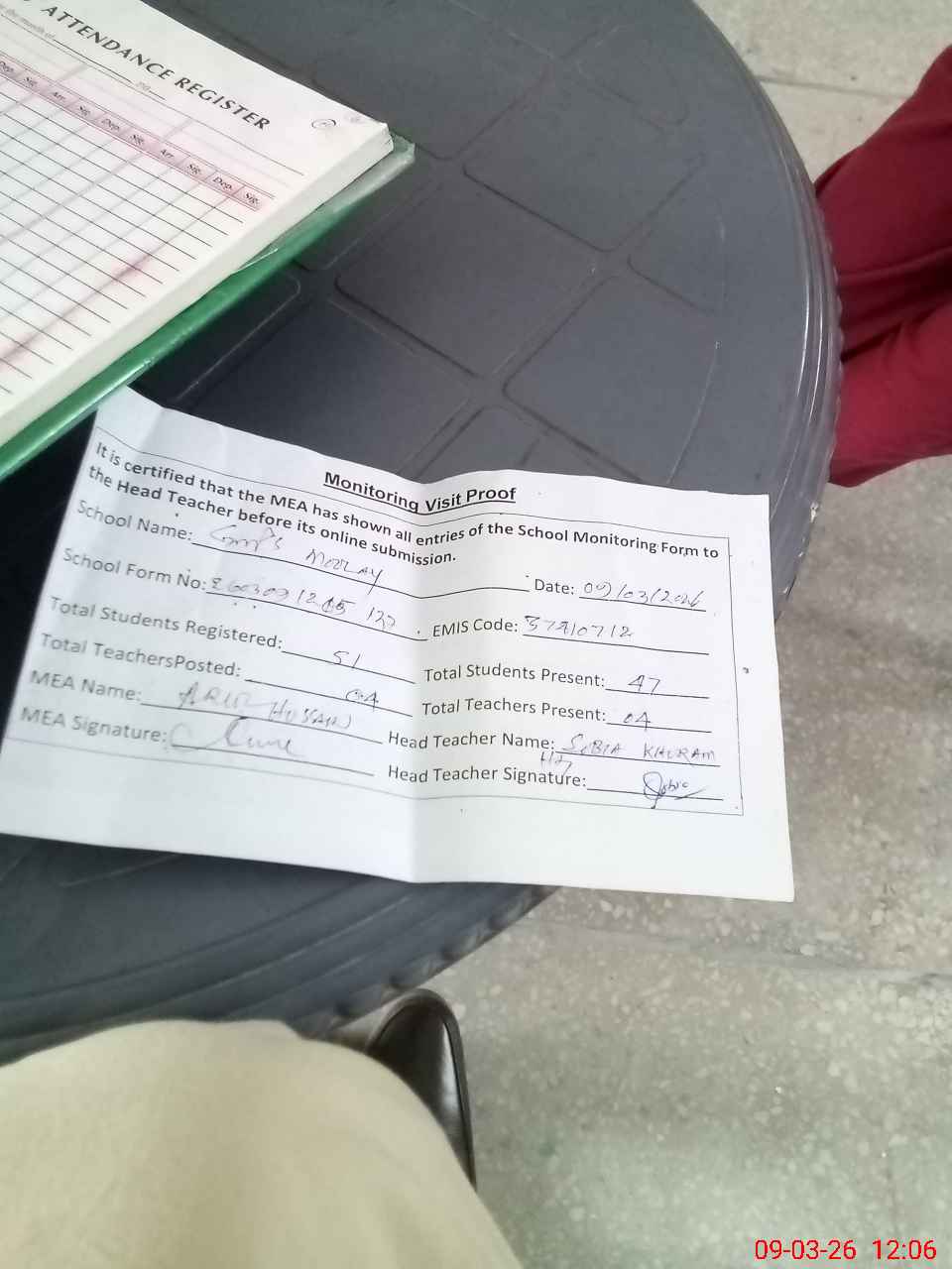 | Attendance Register | Head Teacher | MEA with School | Visit Proof |