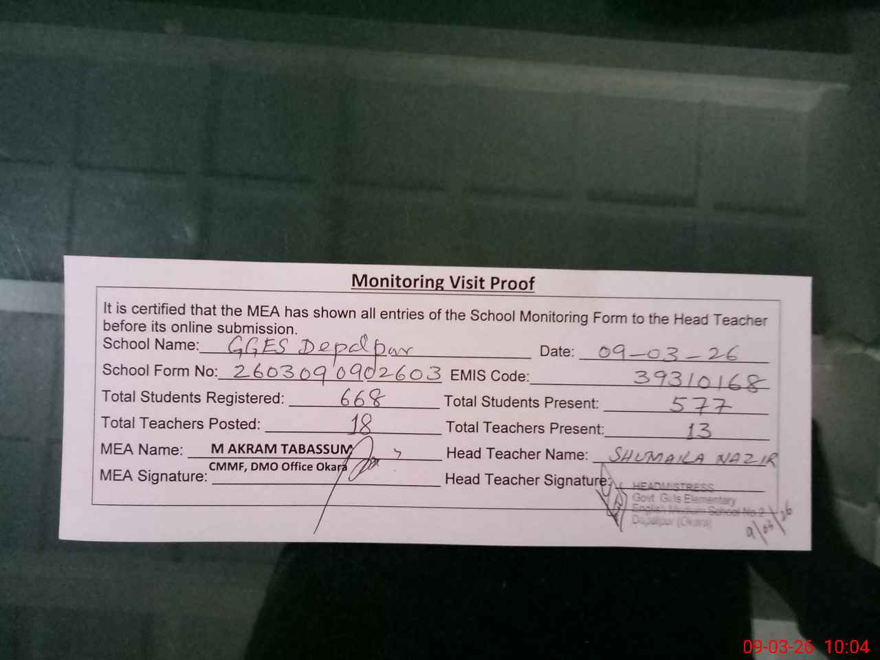 | Attendance Register | Head Teacher | MEA with School | Visit Proof |