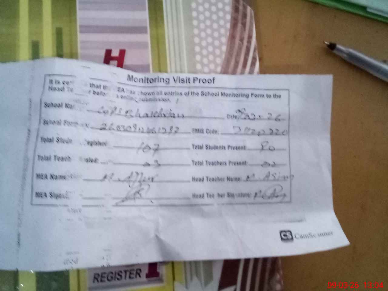 | Attendance Register | Head Teacher | MEA with School | Visit Proof |