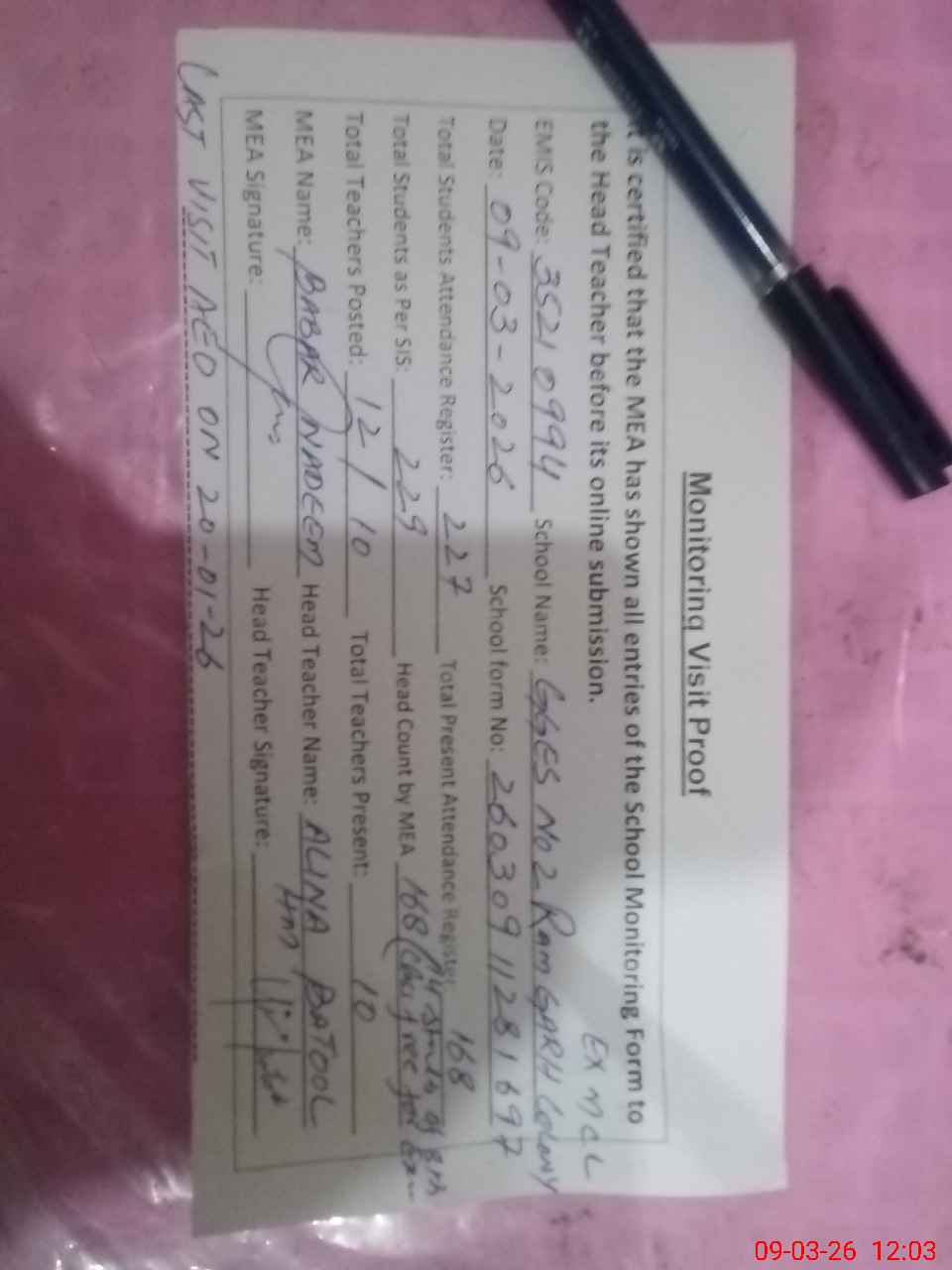 | Attendance Register | Head Teacher | MEA with School | Visit Proof |