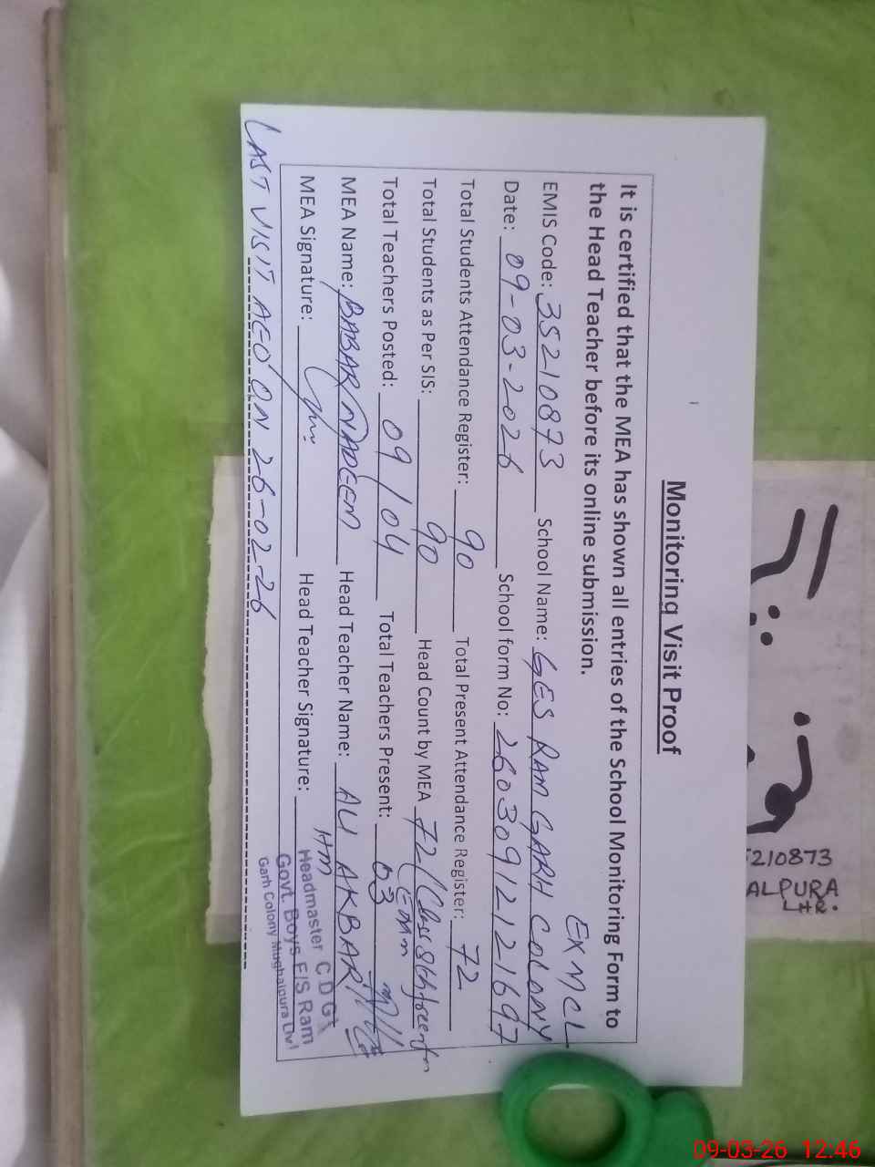 | Attendance Register | Head Teacher | MEA with School | Visit Proof |