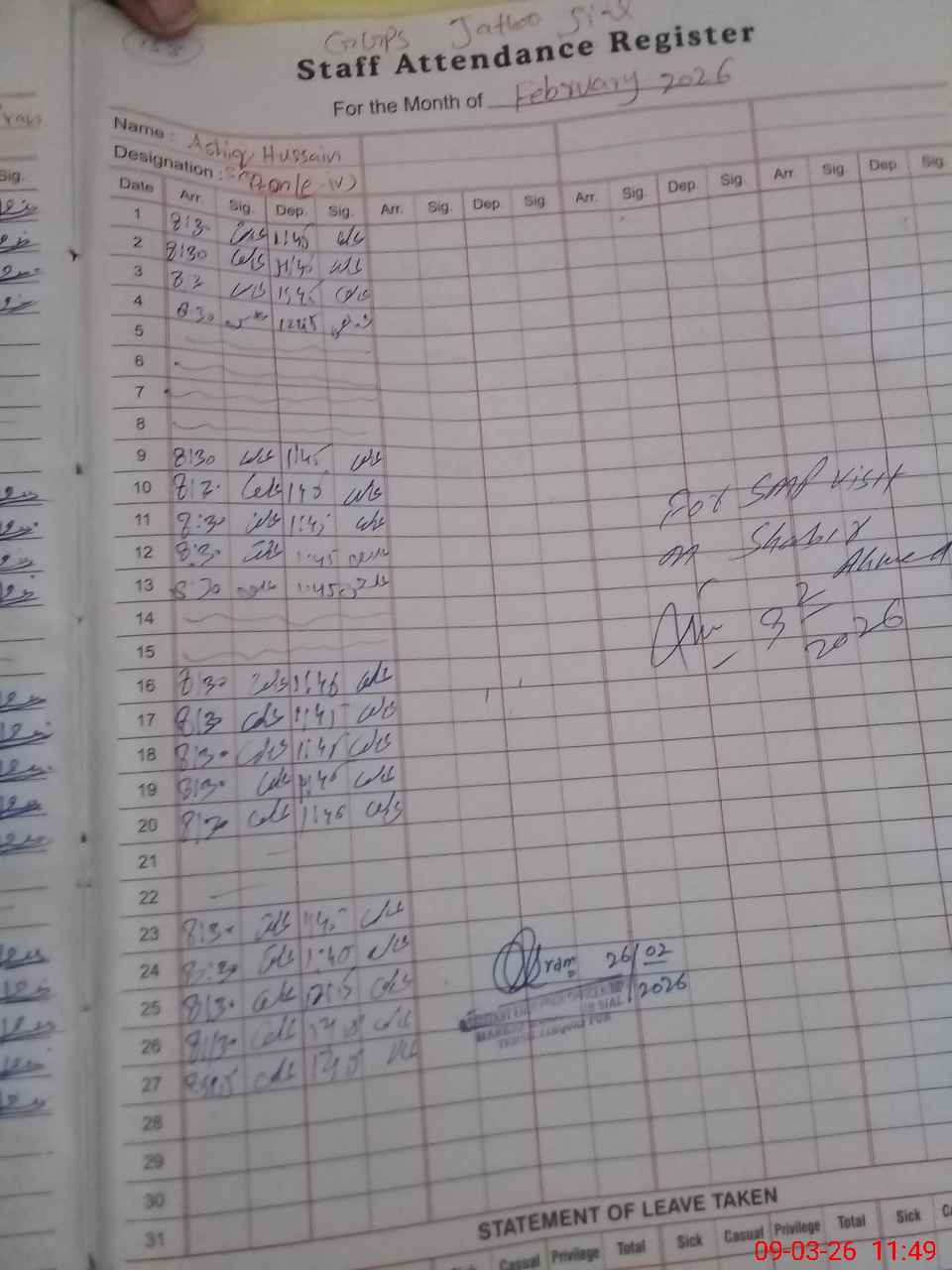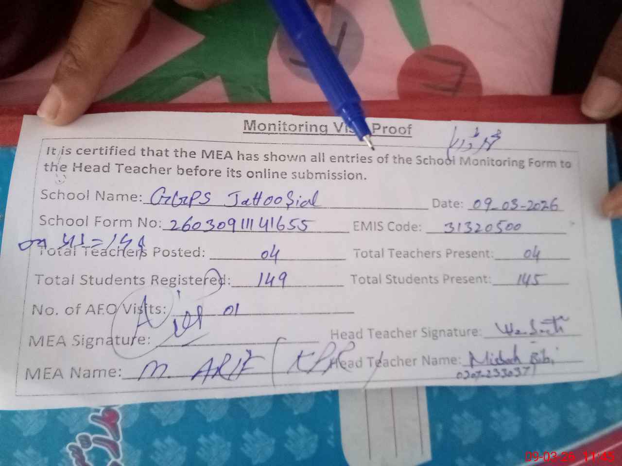 | Attendance Register | Head Teacher | MEA with School | Visit Proof |