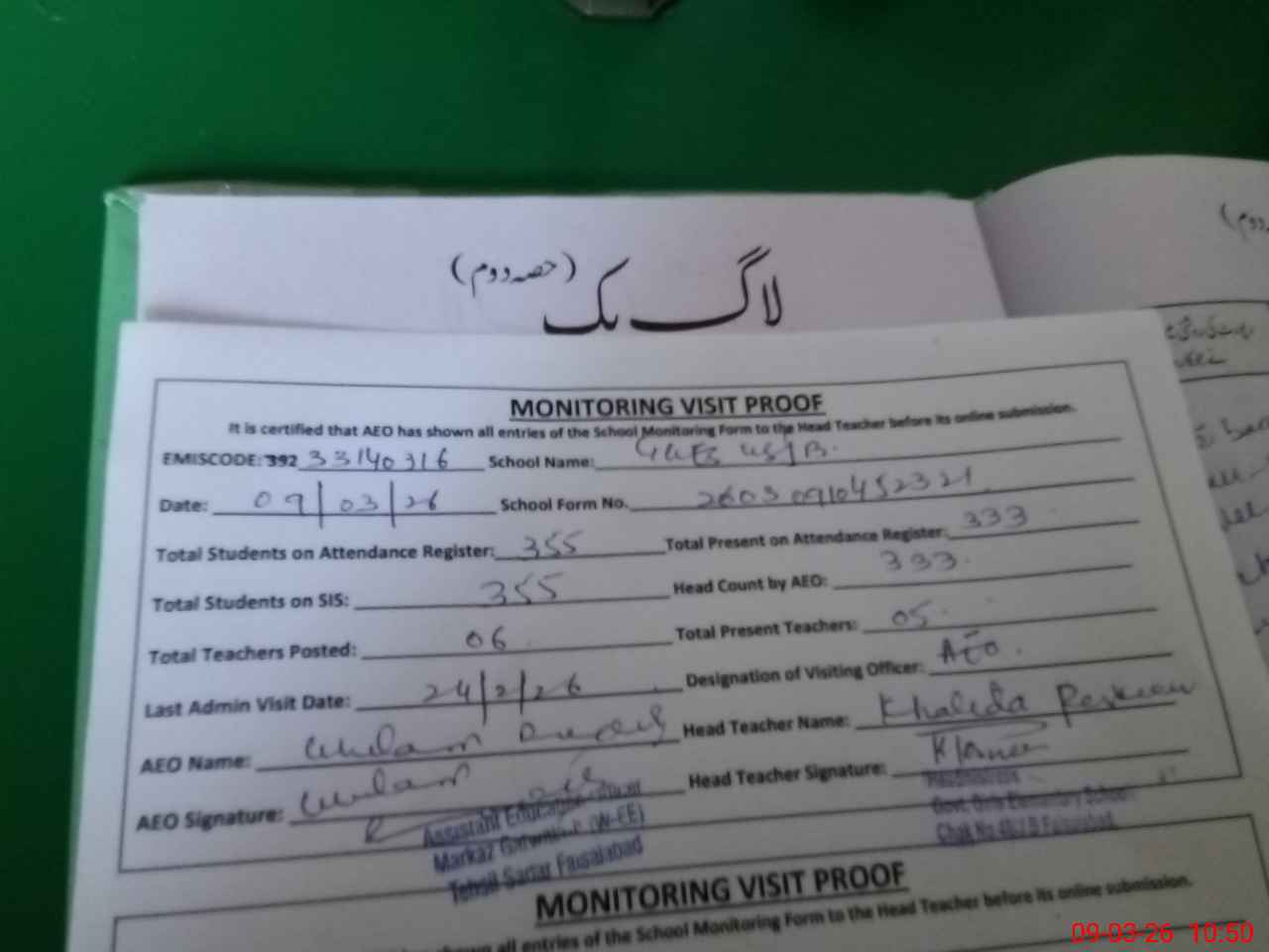 | Certified that this School was Inspected by the Undersigned MEA/DMO Today and the Information Stated Above is as Per Record. | |||||