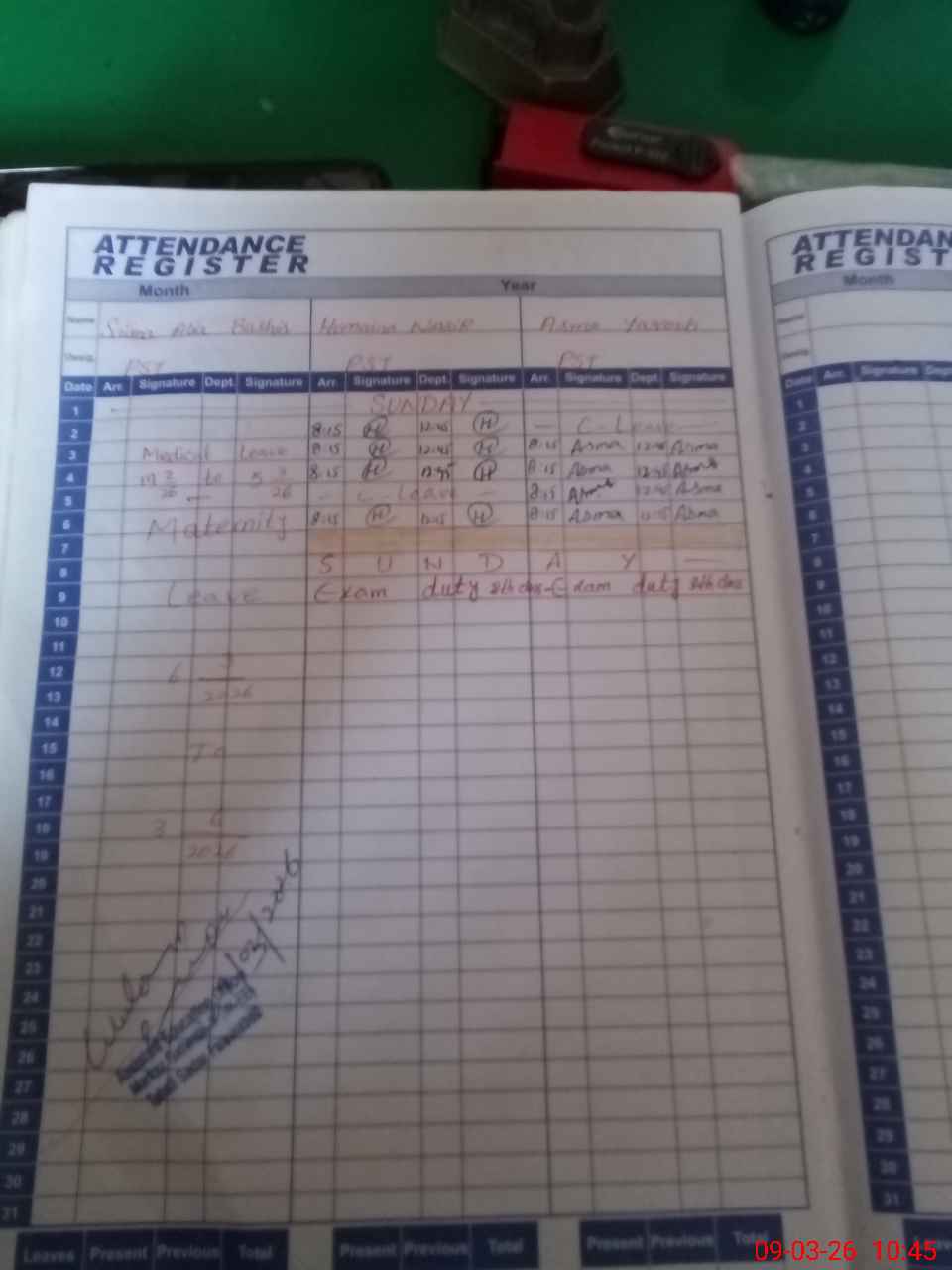 | Leave | Duty | Absent | Maternity | Medical | Ex- Pak |