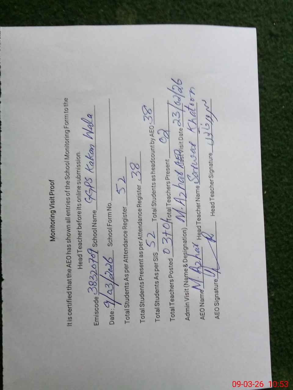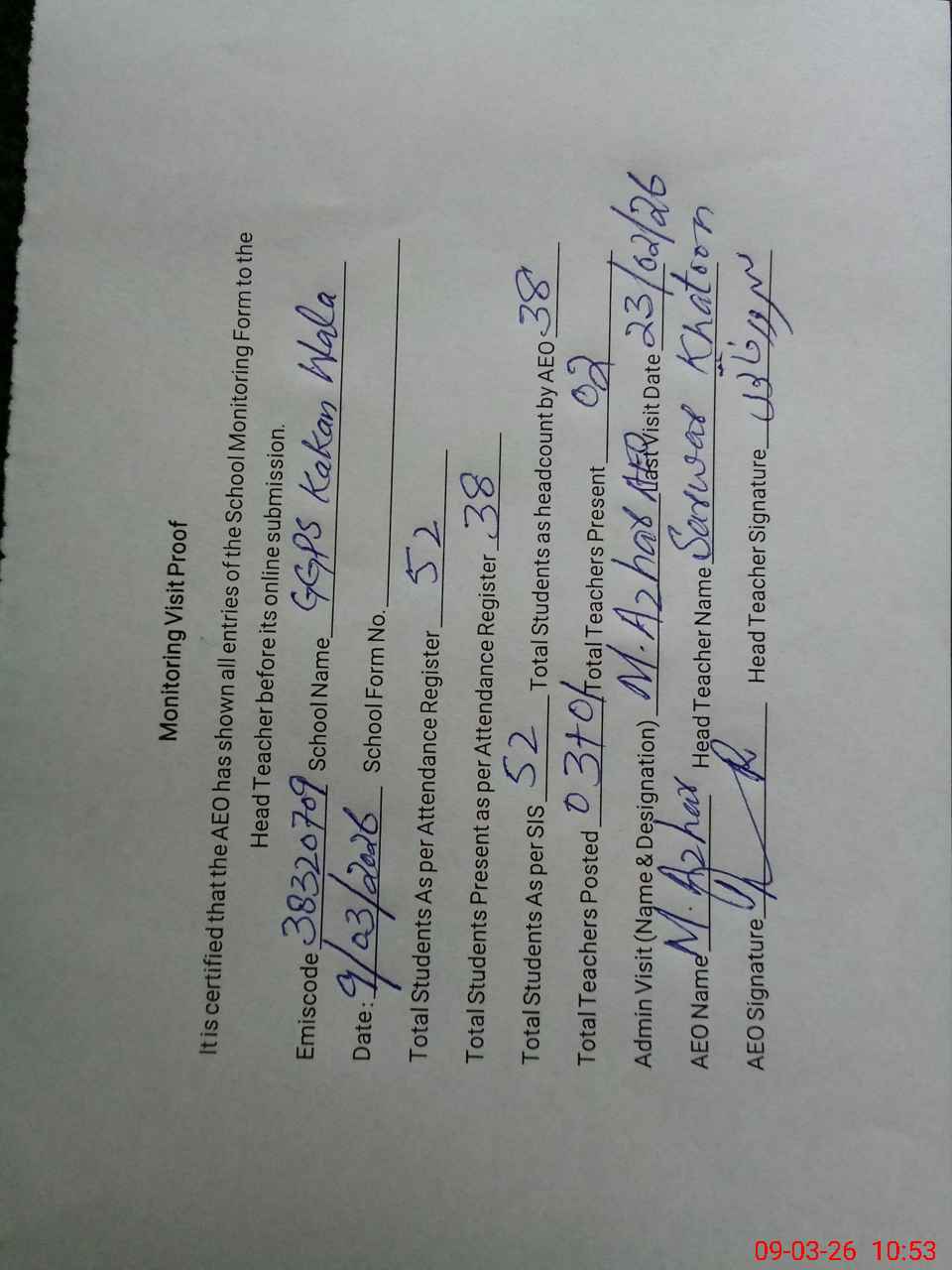 | Monitoring Date: 09-03-2026 | Start Time: 09-03-2026 10:28 AM | End Time: 09-03-2026 10:56 AM | Name of MEA: Mu**** Az**** | |