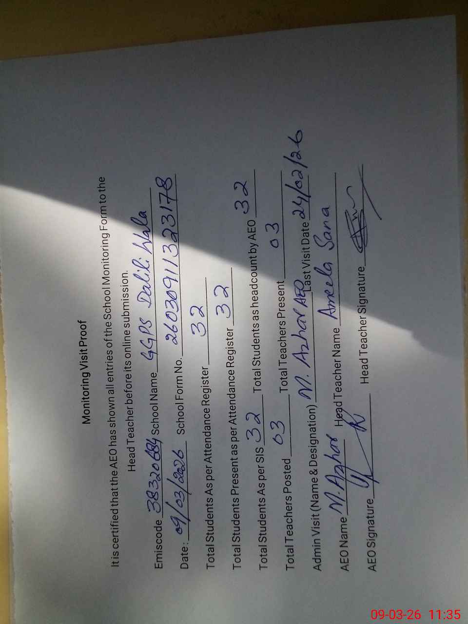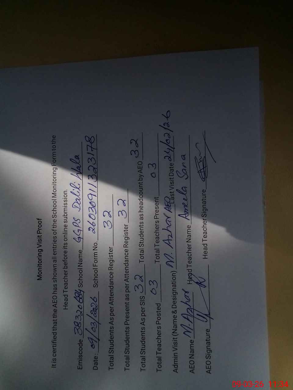 | Attendance Register | Head Teacher | MEA with School | Visit Proof |